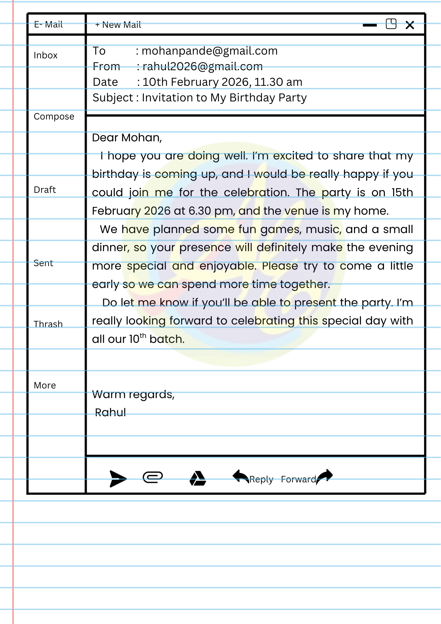 5] Suppose you have to write an email to your friend inviting him or her to your birthday party. Draft an E-mail in a proper format.  (in about100-150 words)