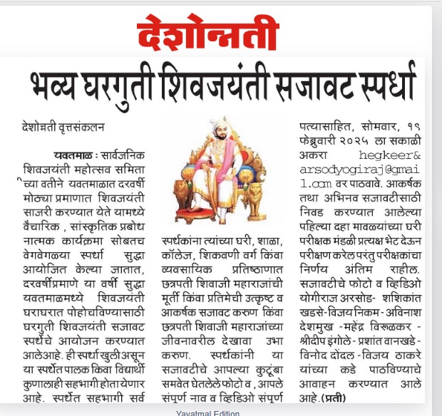 सार्वजनिक शिवजयंती महोत्सव समितीच्या वतीने यवतमाळमध्ये दरवर्षी मोठ्या प्रमाणात शिवजयंती साजरी करण्यात येते यामध्ये वैचारिक , सांस्कृतिक प्रबोधनात्मक कार्यक्रमा सोबतच वेगवेगळ्या स्पर्धा सुद्धा आयोजित केल्या जातात, दरवर्षीप्रमाणे या वर्षी सुद्धा यवतमाळमध्ये शिवजयंती घराघरात पोहोचविण्यासाठी “घरगुती शिवजयंती सजावट स्पर्धेचे आयोजन करण्यात आले आहे. ही स्पर्धा खुली असून या स्पर्धेत पालक किवा विद्यार्थी कुणालाही सहभागी होता येणार आहे. स्पर्धेत सहभागी सर्व स्पर्धकांना त्यांच्या घरी, शाळा, कॉलेज, शिकवणी वर्ग किंवा व्यवसायिक प्रतिष्ठाणात छत्रपती शिवाजी महाराजांची मूर्ती किंवा प्रतिमेची उत्कृष्ट व आकर्षक सजावट करुण किंवा छत्रपती शिवाजी महाराजांच्या जीवनावरील देखावा उभा करुण. स्पर्धकांनी या सजावटीचे आपल्या कुटूंबा समवेत घेतलेले फोटो, आपले संपूर्ण नाव व पत्यासाहित, बुधवार, दिनांक 19 फेब्रुवारी २०२५ला दुपारी बारा पुर्वी खालिल कोणत्याही Whatsaap no. वर पाठवावे. आकर्षक तथा अभिनव सजावटीसाठी निवड करण्यात आलेल्या पहिल्या दहा मावळ्यांच्या घरी परीक्षक मंडळी प्रत्यक्ष भेट देऊन परीक्षण करेल परंतु परीक्षकांचा निर्णय अंतिम राहील. या स्पर्धेत उत्कृष्ट ठरलेल्या सजावटीसाठी प्रथम बक्षीस: २००० ₹ रोख; द्वितीय बक्षीस:१५०० ₹ रोख; तृतीय बक्षीस: १००० ₹ रोख, स्मृतिचिन्ह आणि गौरवपत्र देण्यात येईल. तसेच सहभागी सर्व मावळ्यांना सुद्धा गौरवपत्र देण्यात येईल या स्पर्धेचा बक्षिस वितरण समारंभ मान्यवरांच्या उपस्थितीत, 19 फेब्रुवारी २०२४ ला रात्री साडेआठ वाजता शिवतीर्थावर (छत्रपती शिवाजी महाराजांचा पुतळा परीसर,गार्डन रोड, बसस्थानक चौक, यवतमाळ) होईल.
