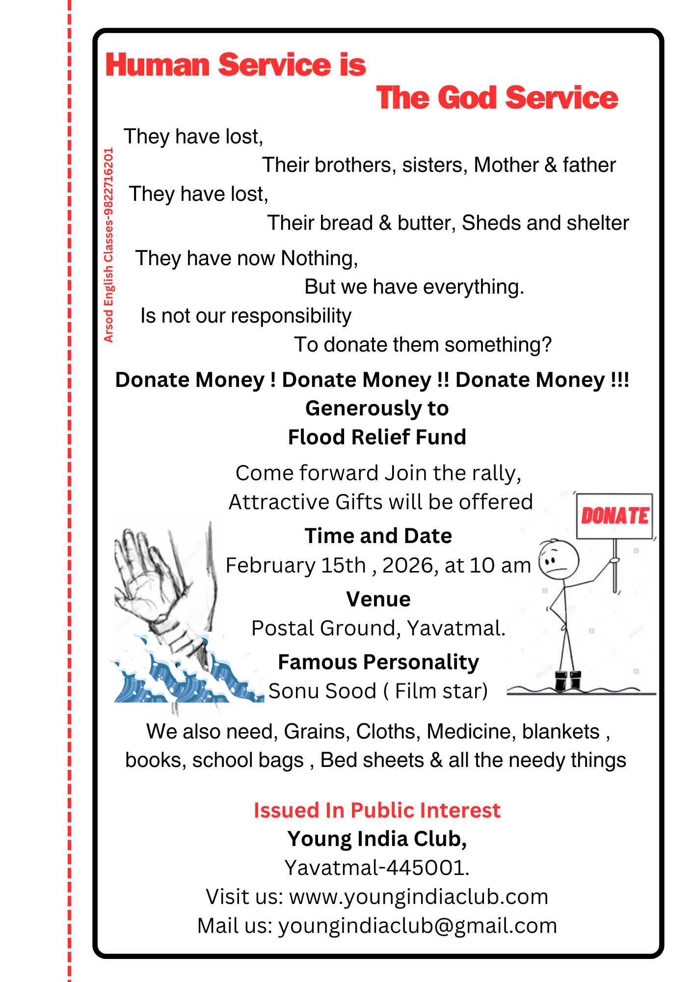 8] You are a member of young India club. You have arranged a rally for the help of Flood relief fund. Prepare a poster to appeal the people to donate generously with the help of the following points.