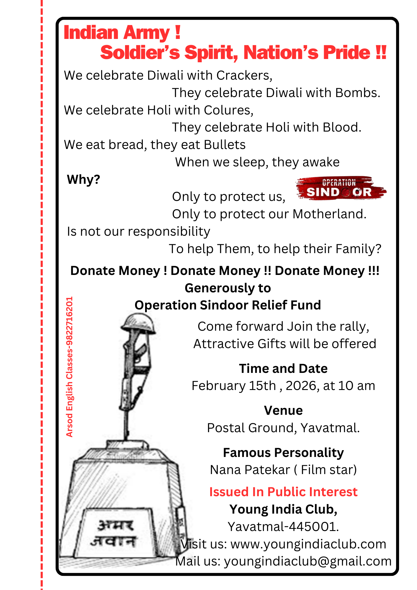 6] You are a member of young India club. You have arranged a rally for the help of Operation Sindoor relief fund. Prepare a poster to  appeal the people to donate generously with the help of the following points.