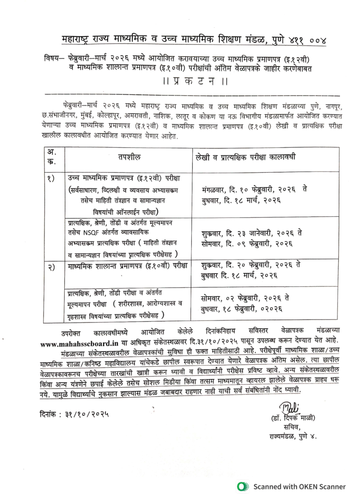 The Maharashtra State Board of Secondary and Higher Secondary has released the Maharashtra Board HSC and SSC Timetable 2026 on 31 October 2025 at its official website www.mahahsscboard.in. As per the Timetable, Class 12th Board Exams will begin on February 10, 2026. The students are advised to carefully go through the complete timetable at board website. we have also shared here the complete exam timetable with a direct link to download timetable in PDF both of HSC and SSC. To avoid any mistake, check the given PDF. For any suggestion feel free to contact  – Click here